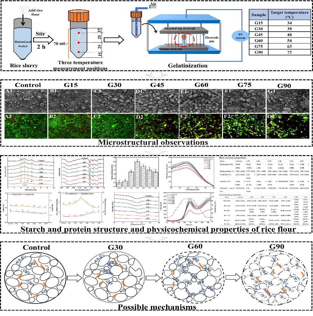 作为无麸质食品的关键原料,米粉因不含麸质蛋白而面临加工难题。研究表明,射频加热技术可通过调控淀粉糊化来改善米粉品质。然而,射频诱导米粉糊化过程中理化性质的动态演变及相关结构转变机制仍不明确。为此,本研究探究了6个目标温度(34、39、48、54、63和72 ℃)下对应不同糊化度(GD)水平(15%、30%、45%、60%、75%和90%)的射频处理对米粉中蛋白质与淀粉结构及理化特性的影响。结果显示,射频诱导糊化过程中,米粉的理化性质与结构变化与糊化度密切相关。随着糊化度增加,米粉的功能特性(膨胀力、起泡性和乳化性)、糊化粘度(峰值粘度、谷值粘度和最终粘度)及营养成分(总蛋白、粗脂肪和直链淀粉含量)均呈现先升后降的趋势,在中等糊化度(45%或60% GD)时达到峰值。结构分析表明,糊化度提升会促进淀粉颗粒表面的蛋白质聚集,降低淀粉短程有序结构、相对结晶度及焓值,并改变蛋白质的二级与三级结构。本研究可阐明射频诱导糊化过程中结构与性能的关联机制,为射频技术在米粉改性中的应用提供理论依据。