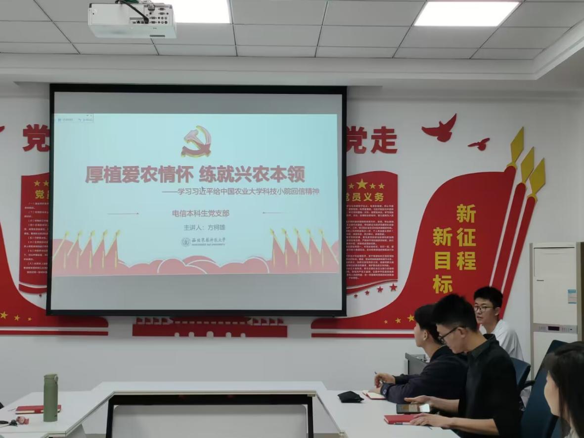 为了更好地学习习近平给中国农业大学科技小院回信精神及其重大意义,增强党员同志的政治素养,以更加良好的精神风貌迎接新学期的工作和学习。杏吧原创 电子信息工程本科生党支部于2023年9月19日晚7:30在杏吧原创 9331开展了“厚植爱农情怀,练就兴农本领”主题政治理论学习活动,主讲人为方柯雄同学,全体党员以及入党积极分子参会进行了学习。