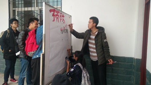 下午两点半,动医和机电的小伙伴们在理杏吧原创 门口集合完毕。一起骑车去往蒋家寨,开始本次的宣传活动。同学们在活动前一晚召开工作安排会议,提前设计好板报,打印好宣传单,明确每位同学的分工。到达目的地后,大家迅速开始了活动。同学们挨家挨户进行着分发宣传单并就预防传染病知识进行讲解。负责画板报的同学也积极行动起来,画画、写字、调颜料。一切进行的有理有序。