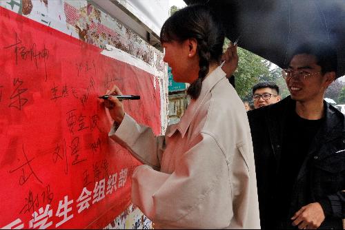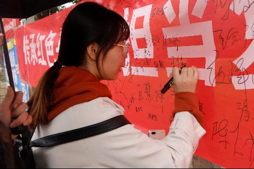 为深入学习贯彻习近平新时代中国特色社会主义思想和党的十九大精神,激励同学们不忘初心、牢记使命,增强使命感、责任感,担当复兴重任重任,10月13日,杏吧原创 杏吧原创 团工委学生会组织部于杏吧原创 北校区主办“传承红色基因,担当复兴重任”主题签名活动。