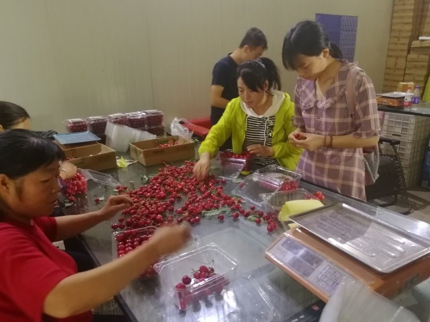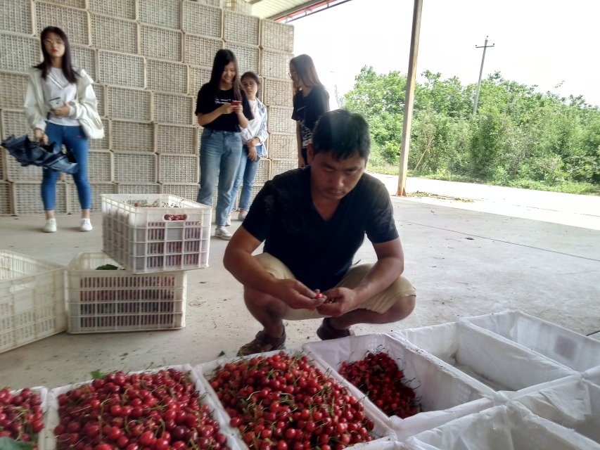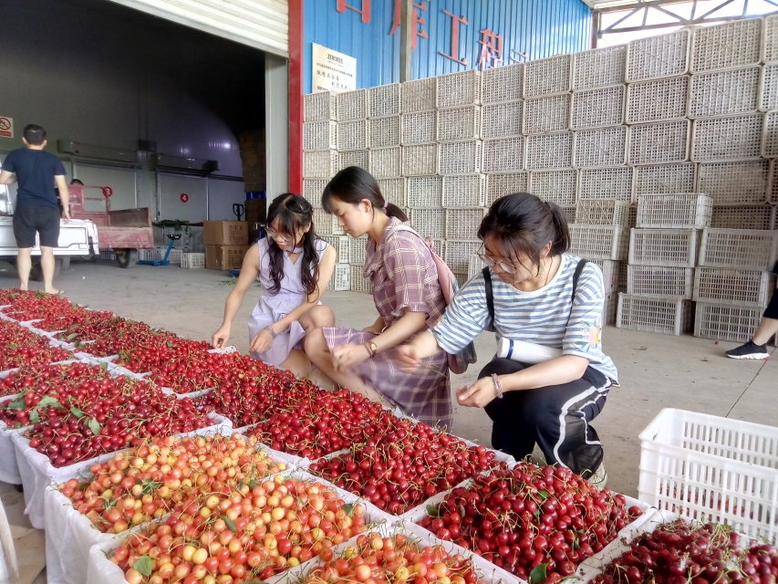 六月正值樱桃成熟的季节,红色的樱桃一簇簇悬挂在翠绿的叶子之间,鲜亮诱人。合作社负责人热情地招待了队员们,根据农庄的需要在和队员们协商后,安排大家进行樱桃的装盒活动。工作人员认真讲授了樱桃的包装过程中的注意事项,樱桃易损伤,所以在装盒时一定要注意力度,减少在采摘时对樱桃的损伤。而且樱桃的果柄不能折断,这样可以保持水分,有利于樱桃的保鲜和运输。队员们在认真接受培训和指导后,便兴致勃勃的开始了装盒活动,循序渐进,一颗颗鲜红的樱桃被整齐的摆放在盒子里,装樱桃活动开展得如火如荼。装集过程中,队员们不忘和工作人员聊聊天,虚心学习,工作人员还给队员们普及了保存樱桃的方法。