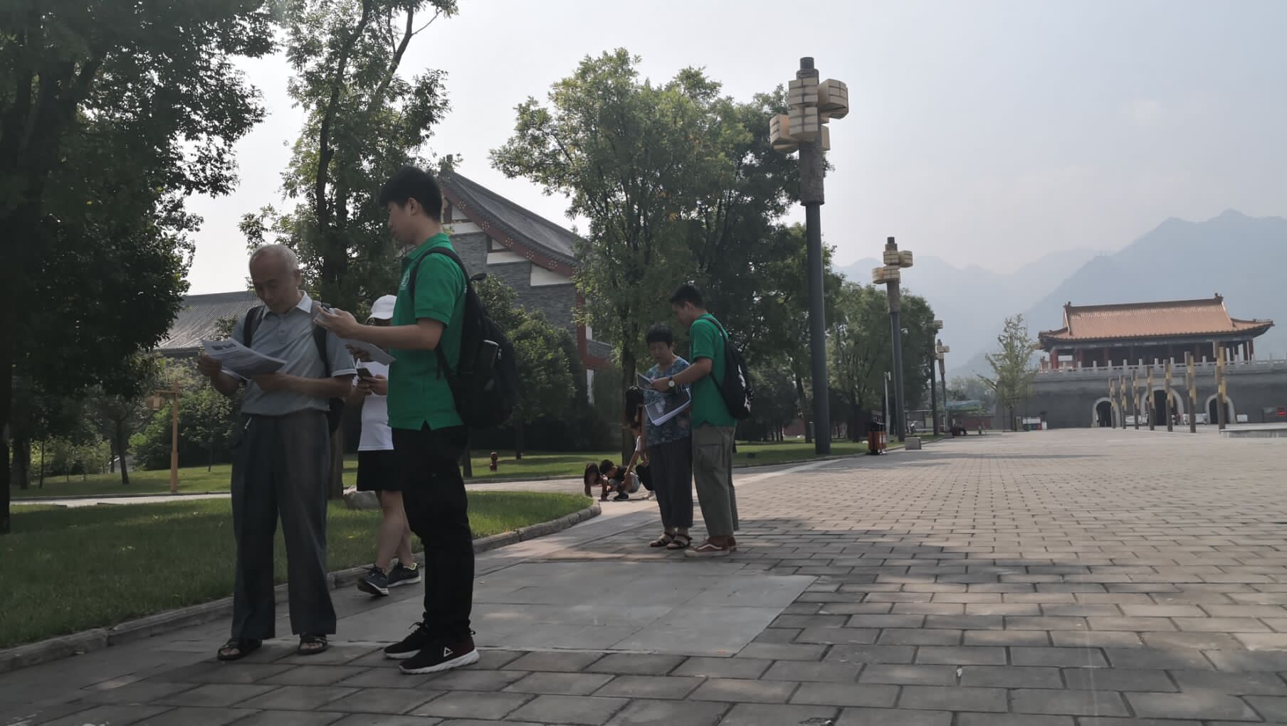 实践调查队成员正在向楼观台游客宣传环保知识并发放宣传传单