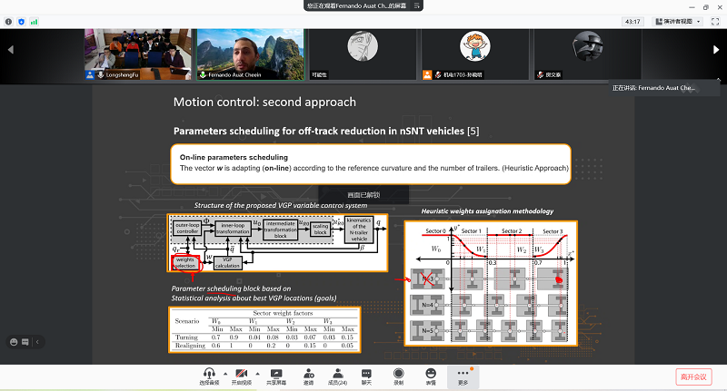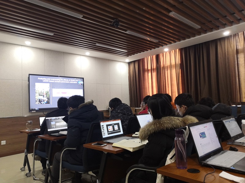 Fernando教授以智利典型农业环境及其团队多年研究为例,分别围绕基于激光雷达的冠层孔隙率和面积估计、GNSS误差对基于激光雷达的果园参数估计的影响、车辆参数估计等方面向师生做了介绍,并深入研讨铰接式车辆的导航及路径规划和田间环境下樱桃的检测及分类。报告结束后,与会师生结合自身研究内容与Fernando教授进行深入交流。