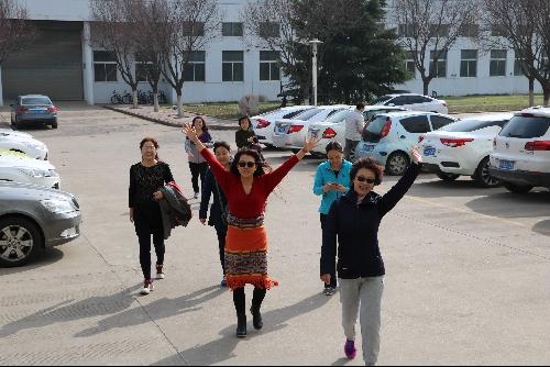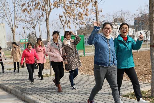 女教职工们步伐矫健,劲头十足。大家快步走着,一路上有说有笑,还不忘欣赏校园美景,心情愉悦。“以后我们每周都要组织一次这样的健身活动”。女教职工们笑着说。