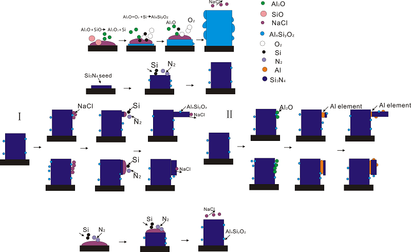 课题组以Si粉为原料,创新性采用盐辅助氮化法制备出富含纤维形貌且含量高达96wt%的高质量氮化硅粉体,并从科学理论视角揭示了Si粉氮化的具体过程和相应产物形貌的生长机制。结果表明:第一阶段(25~900°C)硅粉氮化会出现NH4Cl的分解而形成不定形态堆叠状的Si3N4,在第二阶段(900~1450°C)出现NaCl熔化现象并形成Si3N4,而在第三阶段(>1450°C)的α- Si3N4则会向β- Si3N4转变且因NaCl的蒸发而分为纳米纤维层和包括块状、短针状Si3N4层的上下两层。理论分析发现,NaCl和NH4Cl会促进Si粉的汽化,上层的纳米纤维层产物的生长机制包括VS、VLS等。