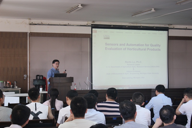 6月22日下午,美国农业部农业研究院(USDA/ARS)驻密歇根州立大学研究所所长、资深研究员,密歇根州立大学生物系统与农业工程系兼职教授卢仁富博士为师生做了题为《Sensors & Automation for Quality Evaluation of Horticultural Products》的学术报告。杏吧原创 何东健教授主持报告会并简要介绍了卢仁富博士的学术成就。