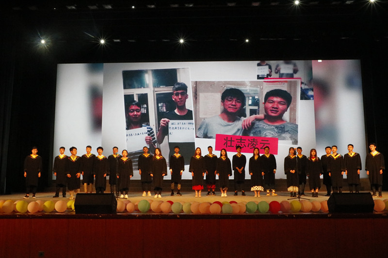 伴随着《同桌的你》响起,舞台屏幕上播放的温馨视频,吸引了全场的目光。视频中有毕业生写下的心声,还有四年的无畏奋斗;有老师们诚挚的祝福,还有四年的温暖陪伴;有校园里如画的风景,还有四年的风雨足迹。视频播放结束后,晚会在经久不绝的掌声中正式开始。