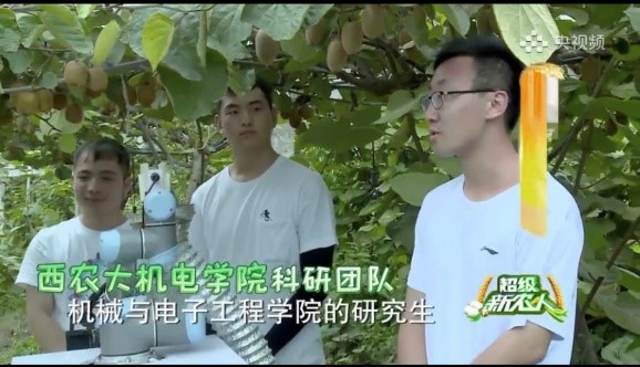 节目中,团队成员李凯、文双涛、卫咏哲向大家展示了猕猴桃采摘机器人 “定位—识别—抓取—采摘—卸果—复位”的整个作业流程,并接受了新农发掘人王二妮发出的新农挑战:挑战在苹果、梨、柠檬等多种水果的干扰下,机器人能否排除干扰,准确识别并连续采摘3颗猕猴桃。经过调试,团队顺利完成了采摘任务,最终挑战成功。同日,团队成员崔功佩、李凯作为代表参加了杨凌融媒体的直播活动,在杨凌智慧农业示范园再次向观众介绍了猕猴桃采摘机器人的研发过程及相关细节。