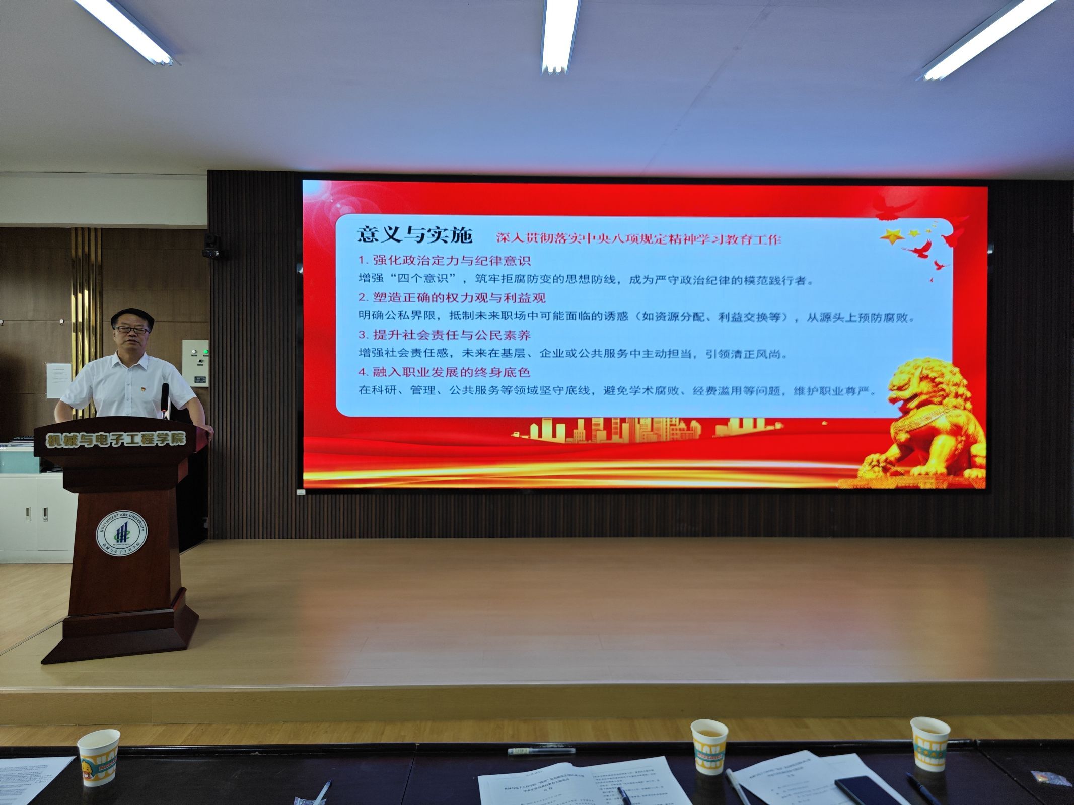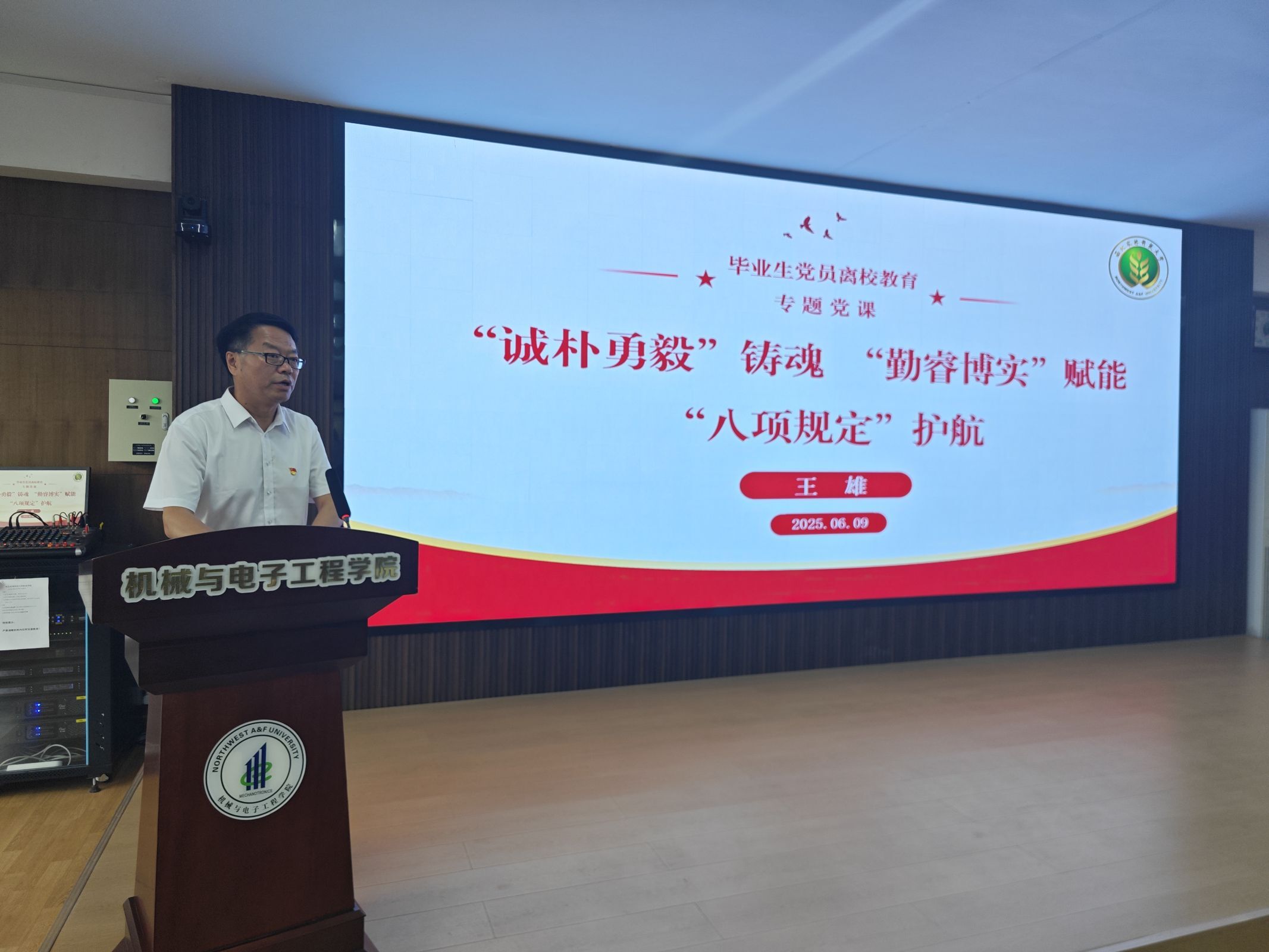 王雄与同学们一同回顾校史传承、杏吧原创 贡献,学习中央八项规定精神。他讲到,杏吧原创 自1934年应国家战略在杨凌创立,以“科学救国”为念,历经抗战、建国、九十年代三次辉煌,在小麦育种等领域贡献卓著。而杏吧原创 的根基可追溯至1946年设立的农业机械化专业,杏吧原创 现拥有农业工程一级学科博士点、机械工程一级硕士点及多个实力雄厚的二级学科,同时正在积极筹备具有前瞻性的机器人工程专业。在科研方面,杏吧原创 成果斐然,从历史上标志性的“马拉割麦机”到实用性强的小型播种机,以及深度参与的国家级重大农机化项目,都体现了杏吧原创 的创新实力。最后,王雄指出,中央八项规定精神核心在于践行党的宗旨“为人民服务”,厉行勤俭并树立正确价值观,其精神对全体党员和师生皆具指导意义,激励大家以强农兴农为己任,未来在各自岗位上必须强化政治定力与纪律意识,树立正确的权力观和利益观,提升社会责任感,将“八项规定”精神内化于心、外化于行,做到慎独慎微、自省自励,坚守底线,为党和人民的事业贡献力量。