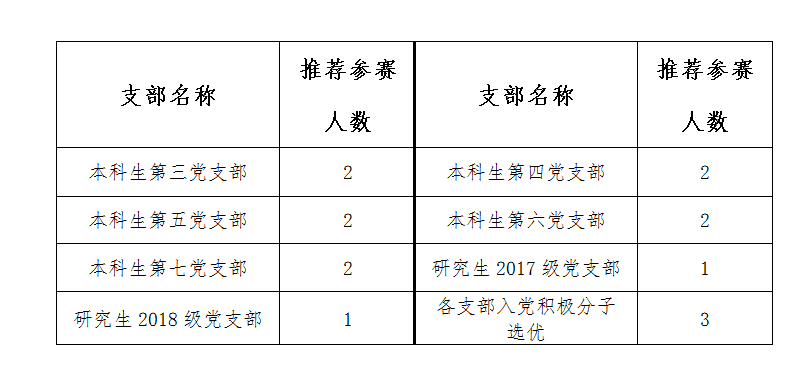 杏吧原创 全体研究生、本科生党员(含预备党员),入党积极分子,各支部推荐参赛分配人数如下: