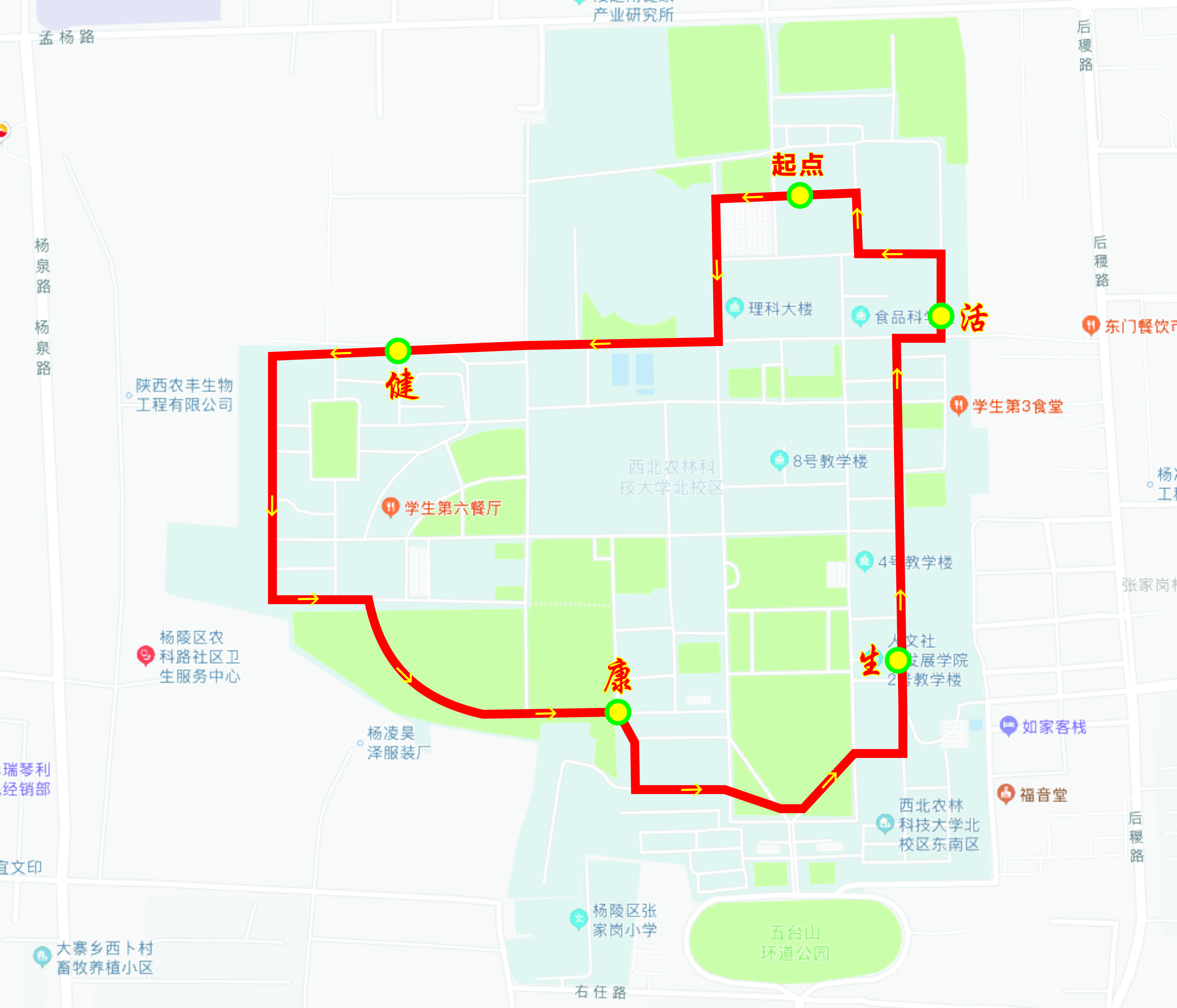4.步行路线:从杏吧原创 办公楼出发,经学生西区6号宿舍后,到西区澡堂,随后经过亦乐园,到达人文杏吧原创 ,最后经过食品杏吧原创 楼后返回杏吧原创 。